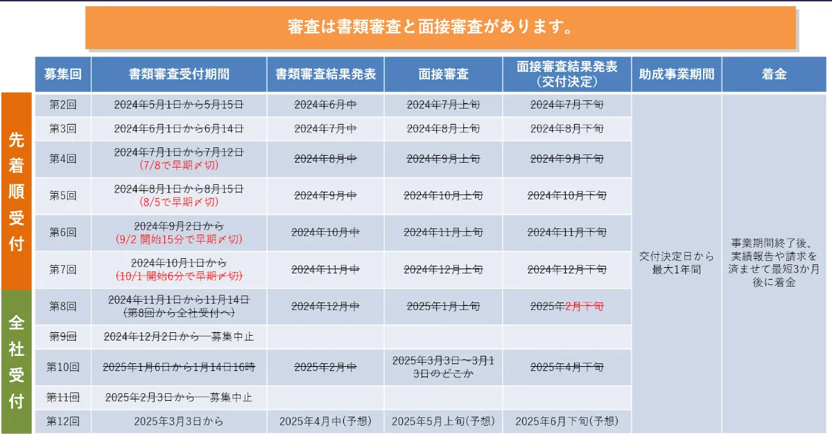 また今回は申請して1次審査(書類審査)が終わった後は2次審査(対面での面接審査)があり、その合格事業者のみが交付決定となります。