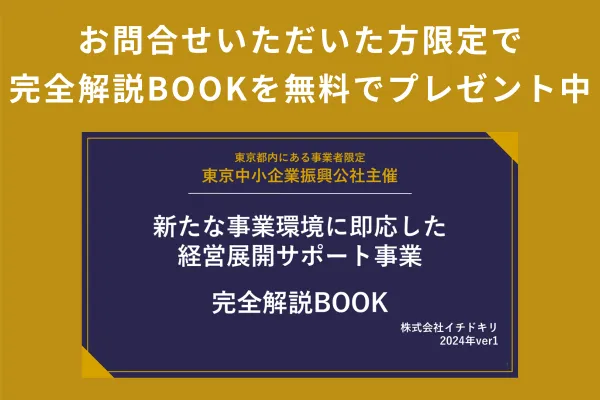 以下の専用ページよりお問合せいただいた方限定で「新たな事業環境に即応した経営展開サポート事業 完全解説BOOK」をプレゼントしております。