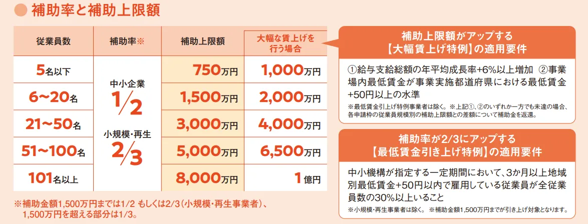 補助上限額は、従業員数に応じて異なり、従業員数が少ないほど上限額が低く設定されています。また、大幅な賃上げを行う場合は、補助上限額が引き上げられます。
