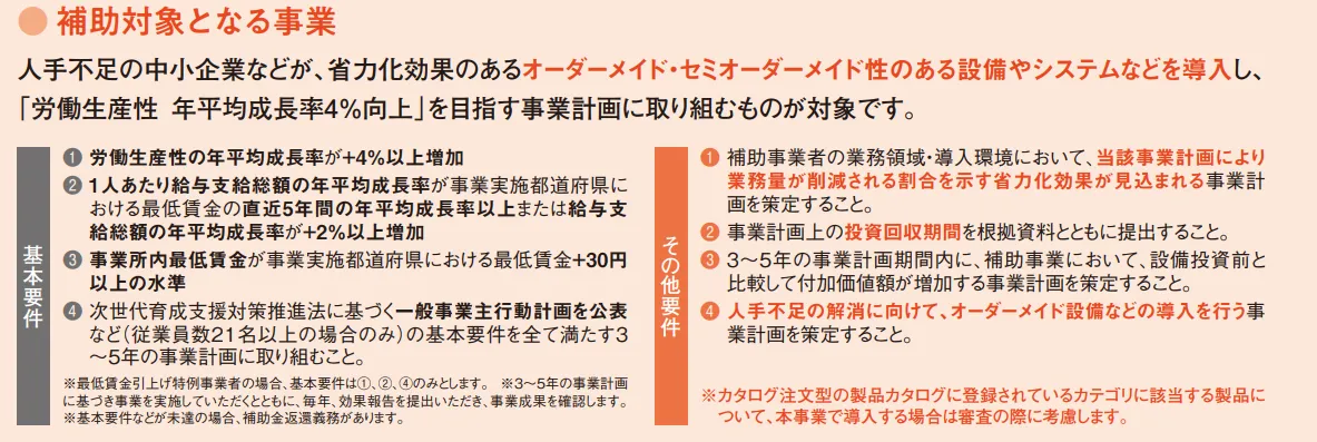 生産・業務プロセスやサービス提供方法の省力化を行う事業が補助の対象となります。