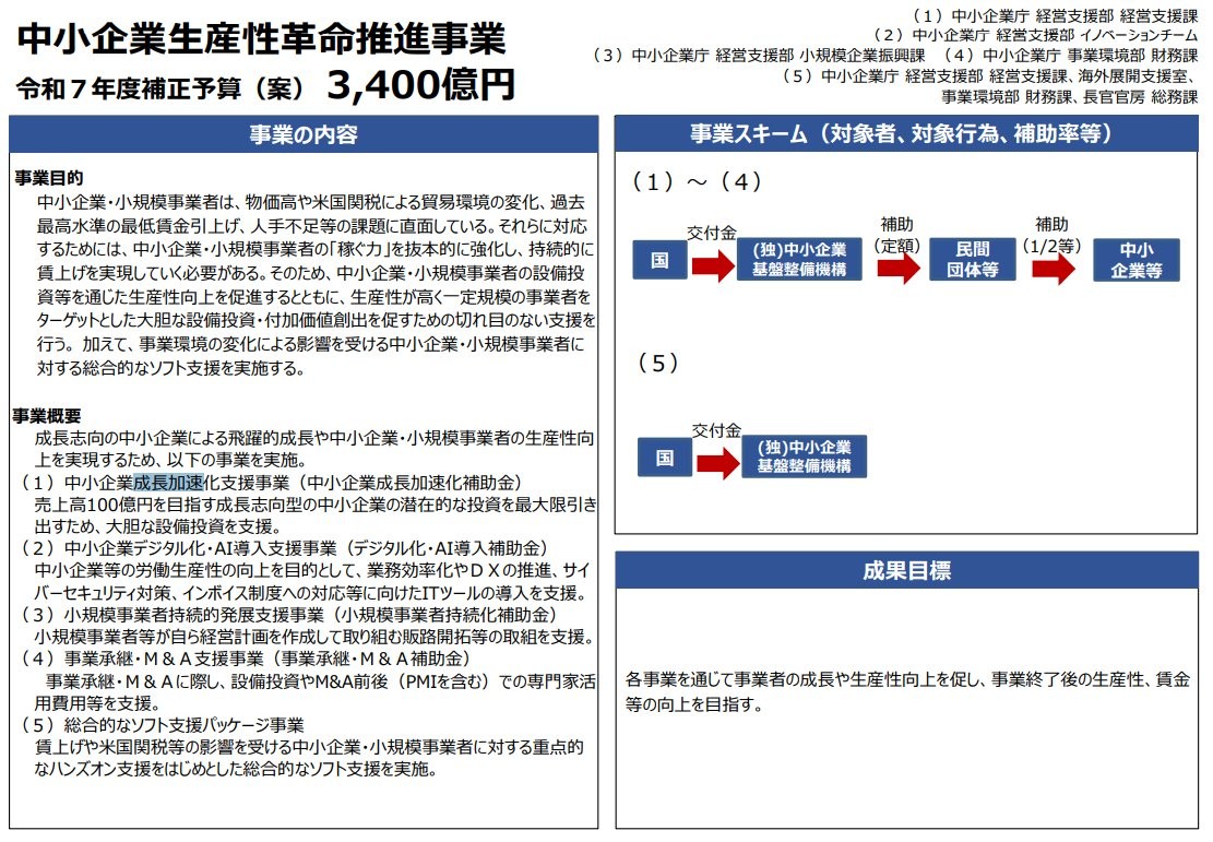 また上記の「中小企業生産性革命推進事業」の3,400億円の枠とは別に、既存基金 1,800億円規模の活用と令和7年度補正予算案には記載があります。