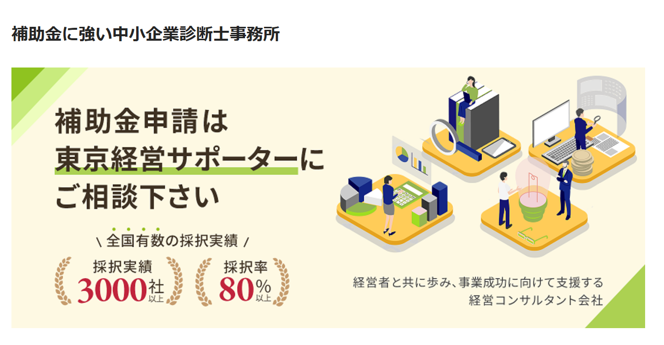 株式会社東京経営サポーターは、10年以上にわたる支援歴と2,000社を超える採択実績を持つ、業界でもトップクラスの経験を誇るコンサルティング会社です。製造業やIT分野に精通した中小企業診断士などの専門家が多数在籍しており、80%以上という高い採択率を維持しています。